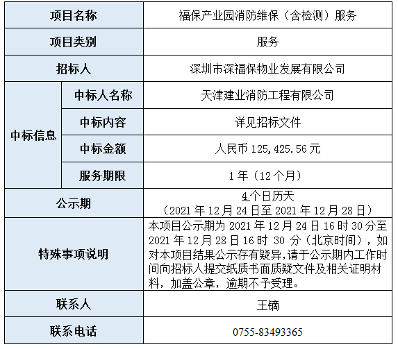 福保产业园消防维保(含检测)服务通过公开招标方式采购并已完成评审,现将本项目评审的相关情况及结果进行公示,具体内容如下: